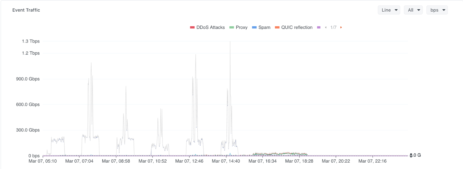 No início deste ano, um ISP regional que chamaremos de ISP-A sofreu um grande ataque distribuído de negação de serviço que atingiu um pico de aproximadamente 1,3 Tbps. Para uma rede desse tamanho, o volume de ataque sozinho normalmente seria suficiente para sobrecarregar a conectividade upstream e interromper os serviços.