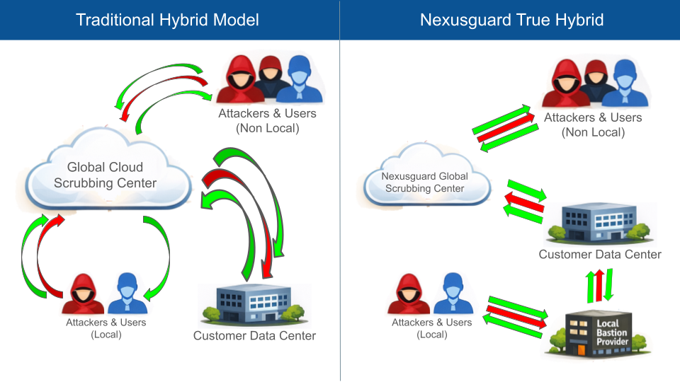 A arquitetura True Hybrid da Nexusguard aborda a proteção contra DDoS de forma diferente, combinando a infraestrutura Bastions implantada localmente com a plataforma de mitigação distribuída globalmente da Nexusguard. Em vez de forçar todo o tráfego por meio de uma rede centralizada de depuração em nuvem, o sistema permite que o tráfego siga o caminho mais eficiente com base em sua origem e topologia de roteamento.